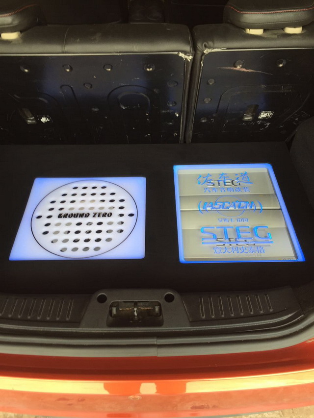 用来推动声场喇叭的两台K401功放和零点12寸超低音单元一起安装在了汽车的尾箱当中,为了增加音响器材的视觉效果改装技师还为声场喇叭和超低音单元添加了灯光效果。