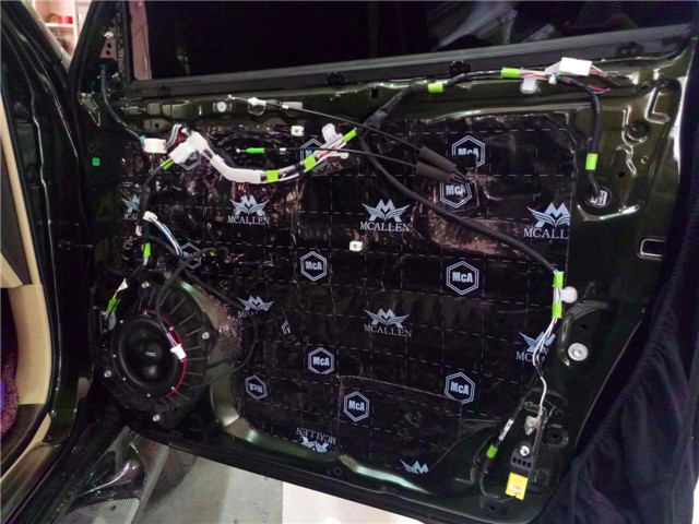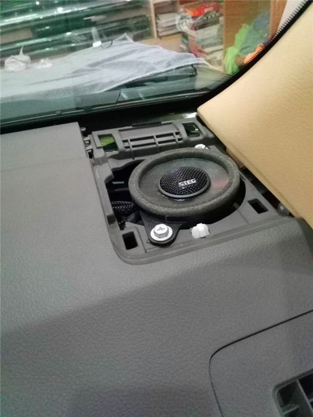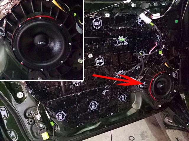 在使用麦卡MCA 环保隔音材料对汽车的门板及其饰盖做了隔音处理之后改装技师将汽车的前声场喇叭替换成了史泰格SQ650C套装喇叭,史泰格系列的喇叭用料充足,技术先进,通过其播放出来的音乐宽阔亮丽,厚度极高,而后门则使用了史泰格SQ650同轴喇叭,这与前声场喇叭也形成了优势互补。