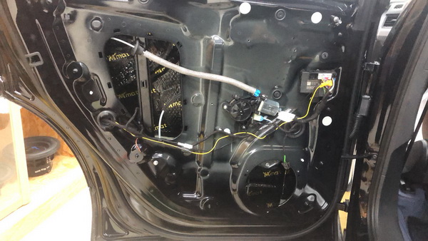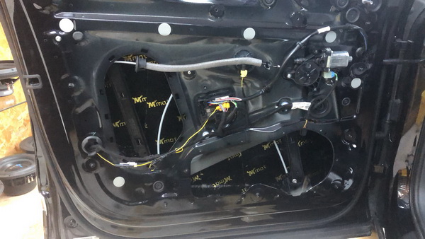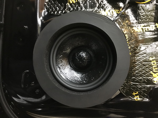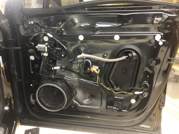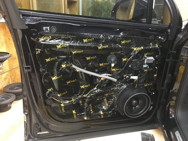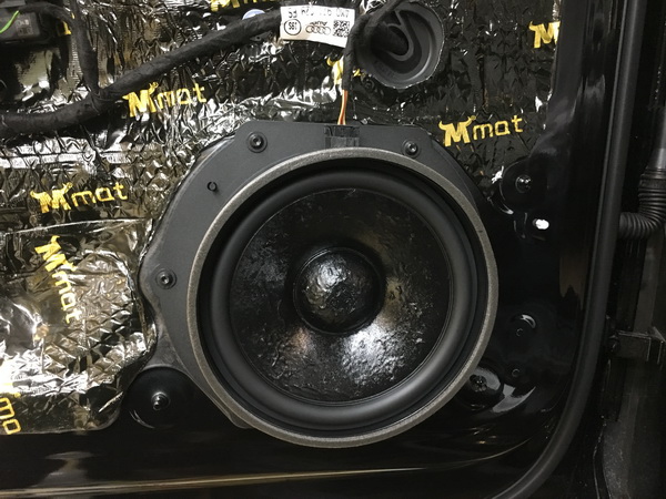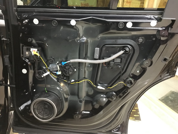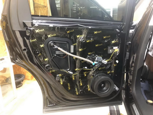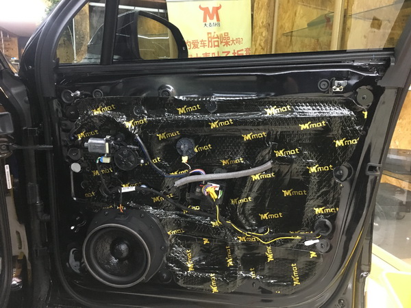 改装师拆下门板发现原车隔音措施非常简陋,就进行了隔音处理。因为门板是安装喇叭的地方,如果没有做好隔音就像是一个漏风的箱体,使声音效果受到影响。对门板的隔音采用双层隔音措施,一层减震一层隔音,吸收门板的声波共振,并有效减少风噪和胎噪的传入,给喇叭创造一个良好工作环境。