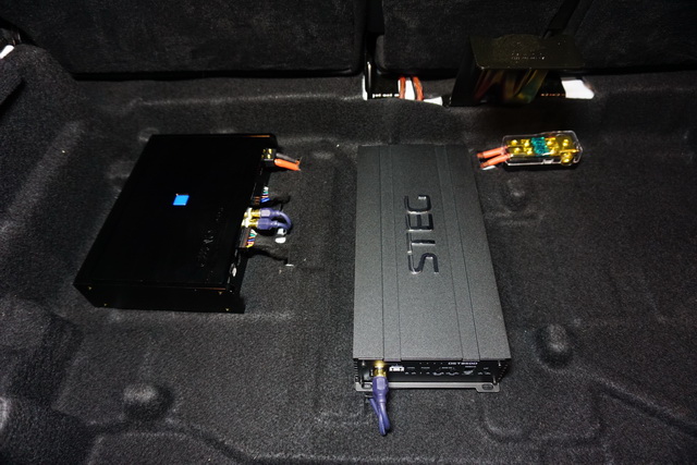 原车主机功率供给较小,直接用主机推动会有一些吃力,所以重庆渝大昌的改装技师,为汽车音响系统,添加了一台爱威DSP-6功放,以使得音频信号更为精准,声场喇叭的功率供给更加充足。而意大利史太格STGE DST850 单声道功放,则用来推动超低音单元,以使得超低音单元发挥更加出色。