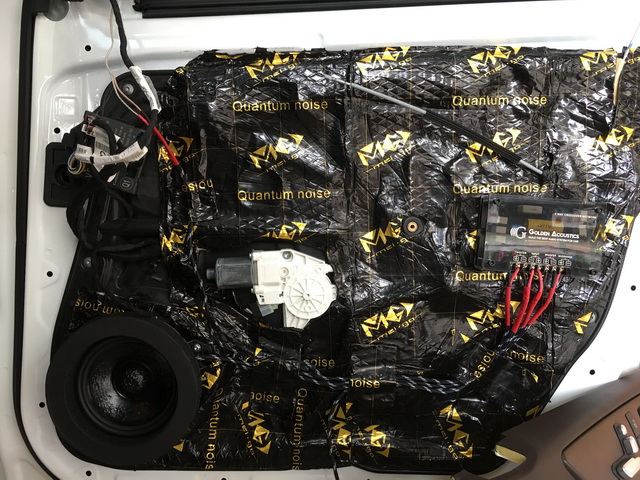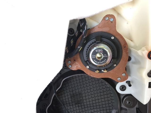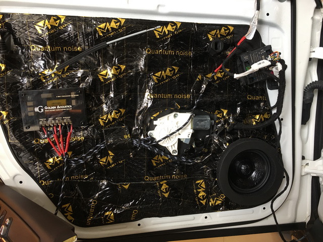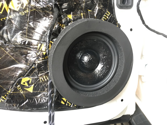 在使用美高隔音材料,对汽车的门板做了隔音处理之后,改装技师将汽车的前声场喇叭,替换成了由史太格STEG ME650C套装和MS30中音,组合而成的三分频套装喇叭,它所播放出来的音乐高频部分高亢亮丽,极具穿透力;中音部分音色饱满,对人声的还原度很高;中低音部分低沉有力。后声场使用的史太格STEG ME650C喇叭,则与前声场喇叭形成了音乐味道的统一性。