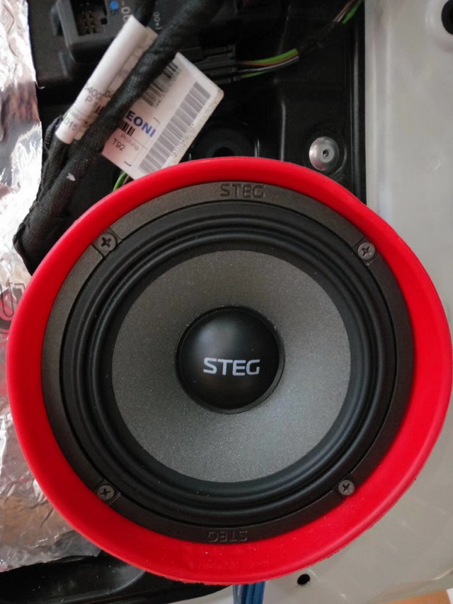 根据车主的听音喜好,改装技师将汽车的前后声场喇叭,都替换成了意大利史泰格MT650C套装喇叭,它的中低音单元使用的是史泰格STEG定制的低谐振高刚性铝盆架,而且使用超大磁力进行驱动,音盆则使用了由编织材料和纸浆混合而成的音盆,让中低音部分音色饱满、富有弹性;高音单元使用了丝质振膜,表面还涂有特殊涂层,可以减少高音的非线性失真,让高频部分通透、亮丽。