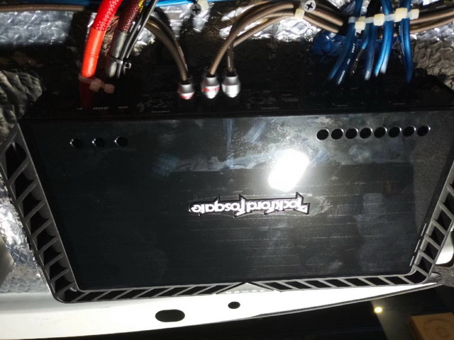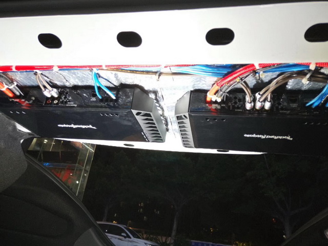原车主机功率供给较小,直接用主机推动会非常的吃力,因此改装技师为汽车音响系统,添加了两台美国来福功放,用来推动声场喇叭和超低音单元,从而让喇叭的发挥更加的稳定和出色。为了避免占据太多的储物空间,改装技师将两台功放,吊装在了尾箱的顶部。