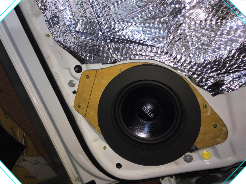 为了改善声场喇叭的工作环境,改装技师使用爱威awave隔音材料对汽车的门板做了双层的隔音处理,其中第一层起到的是止振的作用,第二层起到的是密封的作用。双层的隔音处理降低了风噪对音响品质的干扰。门板隔音处理完成后改装技师将汽车的前声场喇叭更换成了史太格STEG ST650C套装喇叭,它的产品做工精细,用料充足,所以通过其播放出来的音乐也细腻动听、真实自然。