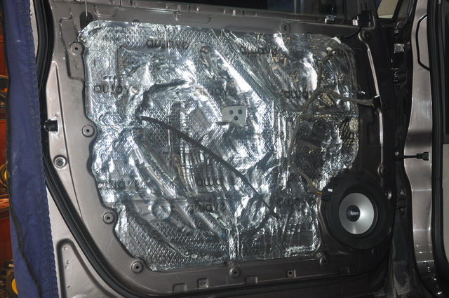 原车门板隔音措施较为欠缺,风噪很容易通过门板传入到车厢内部,对音响品质产生影响。因此改装技师使用爱威awave环保隔音材料,对汽车的门板做了双层的隔音处理,这就让门板形成了一个密封箱体,有效减少了风噪的传入。为声场喇叭创造了一个良好的工作环境。