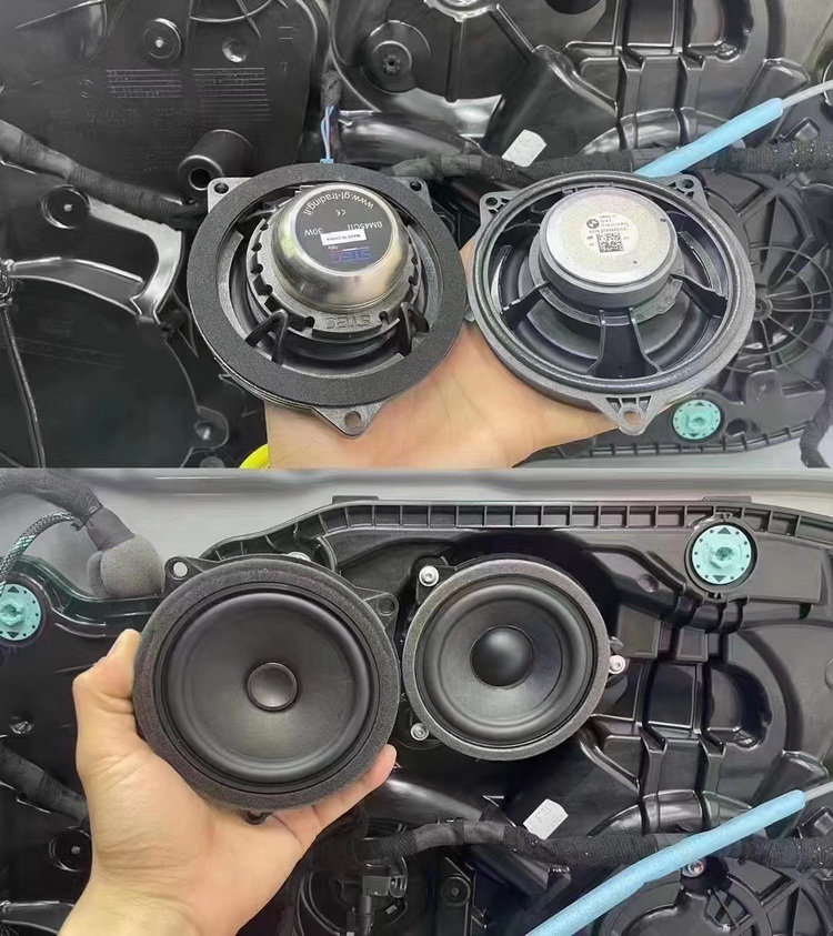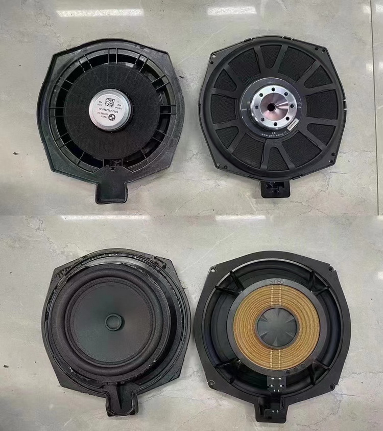 史泰格宝马专用中低音喇叭(右边)和原车中低音喇叭(左边)做比较