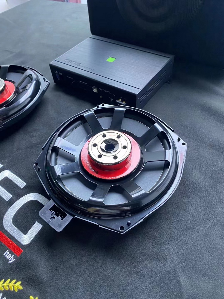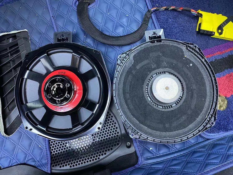 将升级使用的中低音单元和原车的中低音单元做比较,可以看出来,原车的中低音单元磁铁块很小,做工和用料也很一般,可想而知其播放出来的音乐也不会太好。而升级使用的爱威AWAVE BW8宝马专用八寸低音,做工精致、用料充足,而且使用了强力磁铁进行驱动,这使得音乐在中低音部分的表现醇厚、饱满。