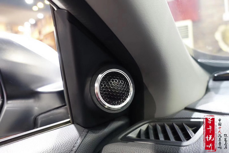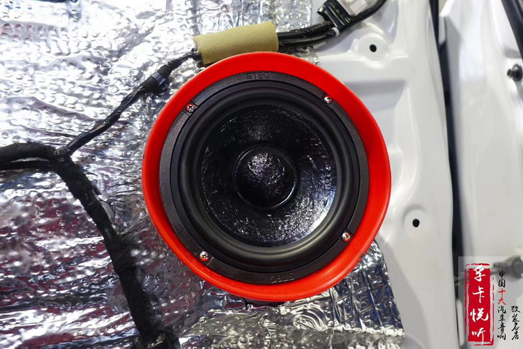 首先在前声场,技师将史泰格ME650C套装喇叭安装在汽车原位。这套喇叭的中低音,采用了表面凹凸不平的松压纸质音盆,声音非常醇厚,声底暧调而又温润,搭配铝质盆架,使整个喇叭反应速度快,并且经久耐用。而高音采用28mm的丝膜球顶高音,采用钕磁强力驱动,外壳是用CNC高光处理的铝架,具有良好的柔和听感,并且指向性相对较好,能够再现真实自然的音乐原声,非常适合车主的听音喜好。搭配后声场相同品牌的SE650C两分频作补充,能够使音乐的听感更加饱满、立体,现场感更强。并且为了给喇叭提供一个良好的工作环境,改装技师还对门板进行了隔音升级。