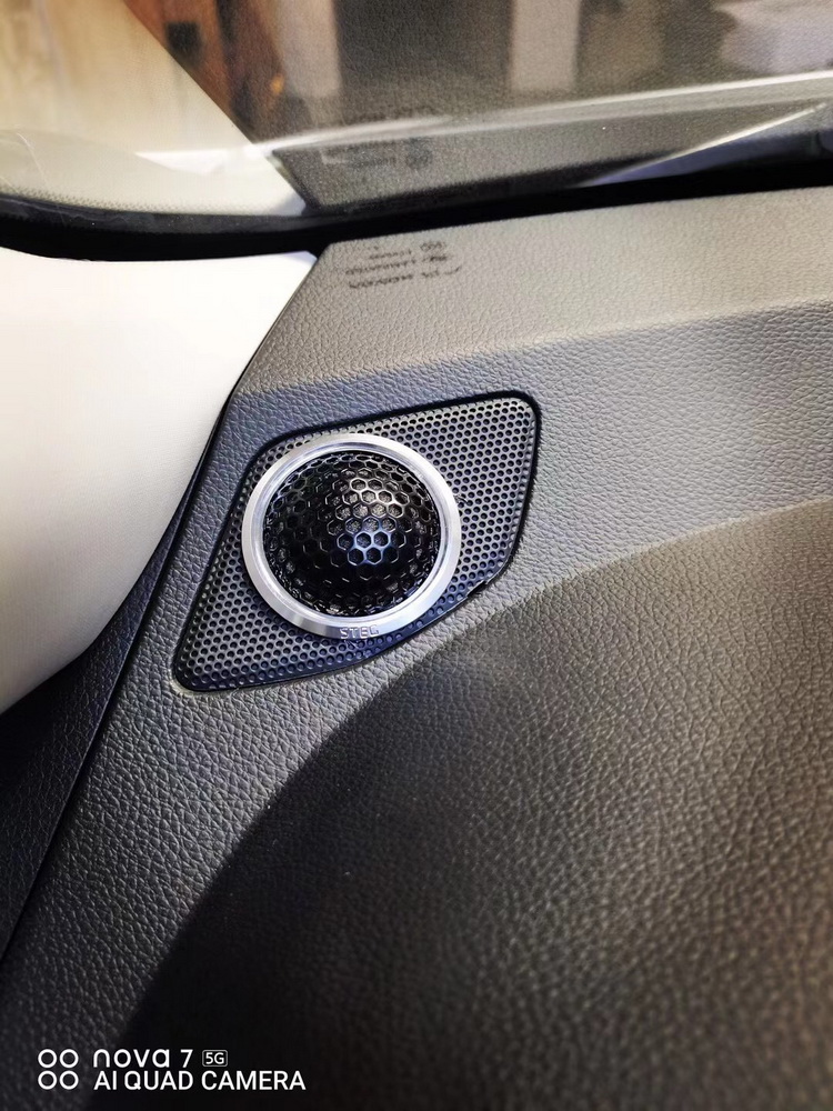 在对汽车门板做好隔音升级后,改装技师将前声场喇叭升级为意大利 史泰格ME650C套装喇叭。这套喇叭的中低音,采用了表面凹凸不平的松压纸质音盆,声音非常醇厚,声底暧调而又温润,搭配铝质盆架,使整个喇叭反应速度快,并且经久耐用。而高音采用28mm的丝膜球顶高音,采用钕磁强力驱动,外壳是用CNC高光处理的铝架,具有良好的柔和听感,并且指向性好,非常适合车主的听音喜好。加上后声场相同品牌的意大利 史泰格MS650作补充,可以使音乐的听感更加饱满、立体,音响的现场感更强。