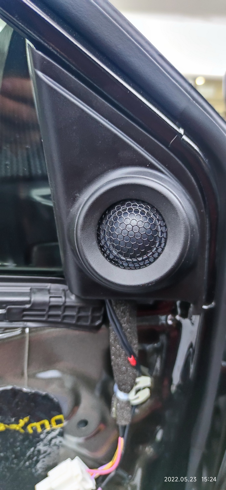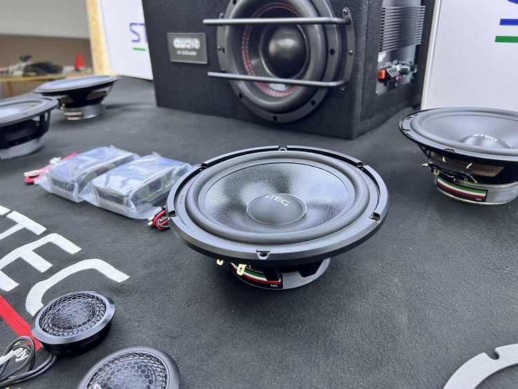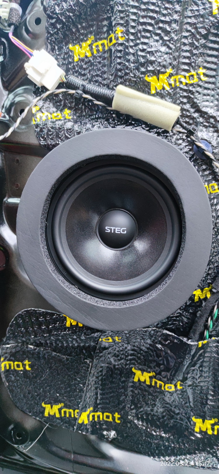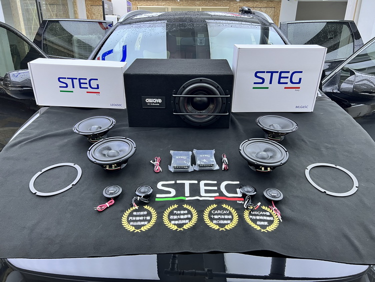 前声场选用的是意大利steg MLG65C套装喇叭,它的中低音单元使用的是复合纸质音盆,并使用了大音圈设计,让中低音部分音色饱满,富有感染力;高频部分使用的是丝膜球顶设计,让高频部分自然通透、十分亮丽。经过声场定位以后,技师将高音单元安装在了门板三角位处,中低音单元则原位安装。后声场使用的是意大利steg LEO650C喇叭,这既能让后排乘客听到优质的音乐,也能够保证音乐味道的统一性。