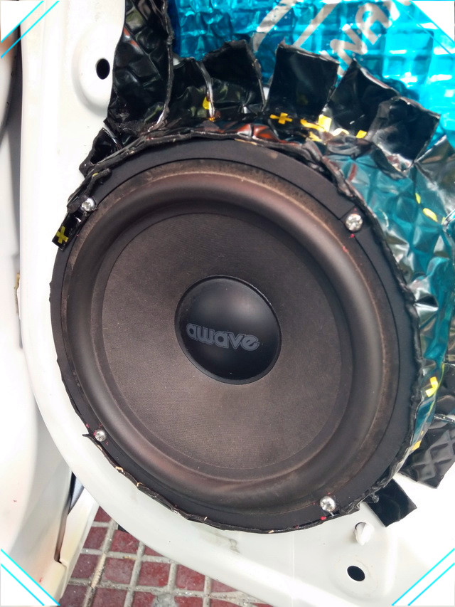 为了将音乐做到中央,江门爱音乐的改装技师将 爱威awave AW-H653F 套装喇叭的高音单元和中音单元经过角度调整以后倒模安装在了汽车的A柱上,而后声场使用的DB ES360同轴喇叭则安装在后门板上。前后声场喇叭的配合能够让音乐的展现形式更加的丰富。为了增加汽车的听音氛围,改装技师还为汽车添加了一只STEG史太格ST12 12寸超低音。