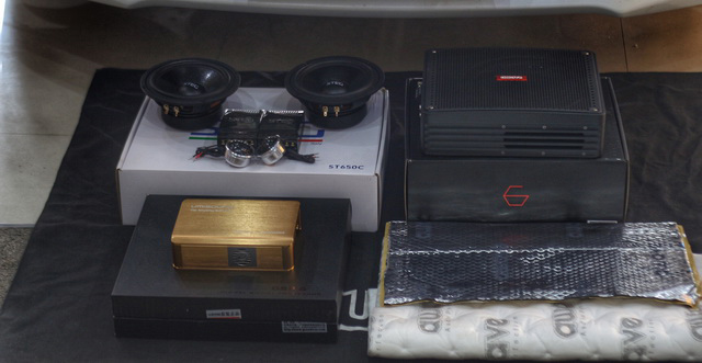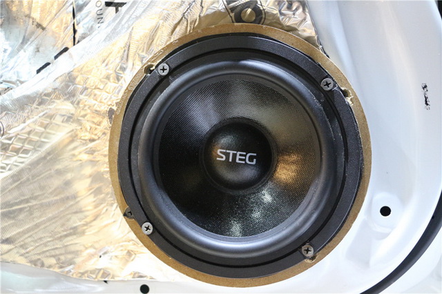 在使用awave隔音材料,对汽车的门板和饰盖做了隔音处理之后,改装技师将汽车的前声场喇叭,改装成了意大利STEG史泰格ST650C套装喇叭,它的中低音单元使用了特殊配方的纸质音盆,音盆边缘使用进口橡胶边进行保护,使得中低音喇叭弹性十足,而且具有良好的运动特性。高音单元使用丝质振膜,让高频部分高亢亮丽,极具穿透力。