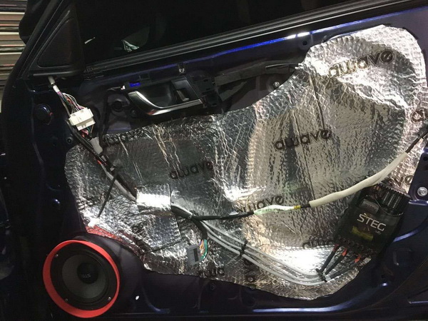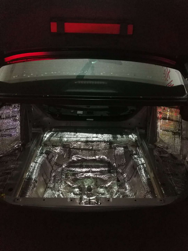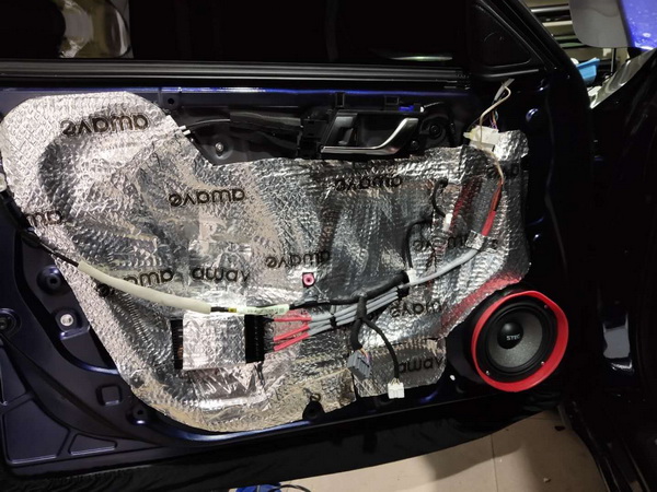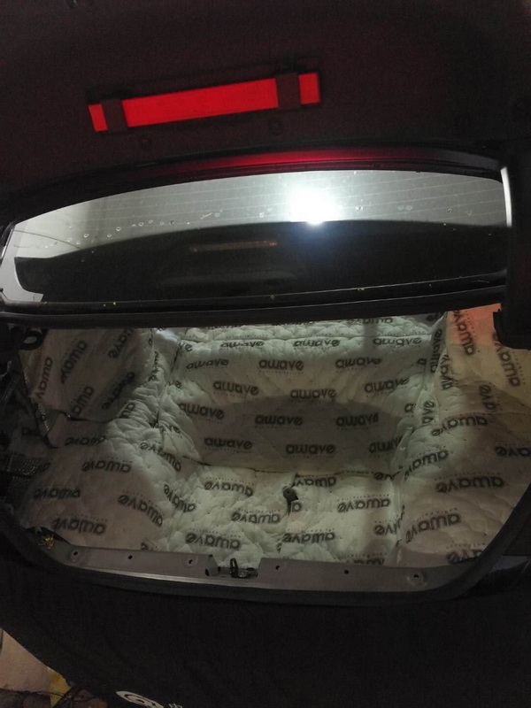 在进行音响改装前先进行隔音改装,对门板和尾箱部位改装师分别进行了隔音处理,门板部位是安装喇叭的地方,良好的声场环境十分重要,使用爱威隔音材料对门板进行三层隔音处理,有效减少来自外部的风噪和胎噪,爱威隔音材料全部通过ROHS认证,吸音系数认证和防火认证,使用更安心。