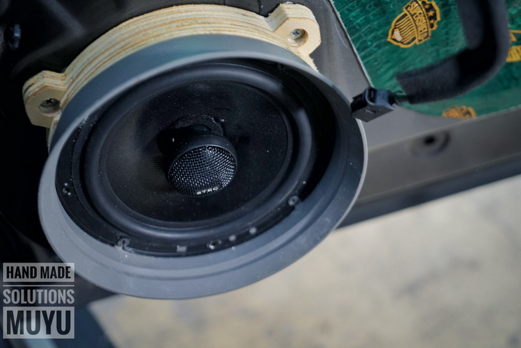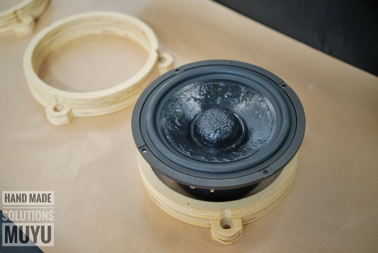 更换喇叭之前先使用大能隔音材料,对汽车门板做了隔音处理,以降低门板共振对喇叭的干扰,使喇叭有一个良好的工作环境。前声场喇叭升级为汽车音响品牌-意大利史泰格ME650CII 套装喇叭,它的中低音单元使用了经典的松压纸质音盆,让中低音部分音色饱满。醇厚,独具韵味;高音单元使用了高端丝质振膜,让高频部分自然通透。后声场搭配一套意大利史泰格MS650同轴喇叭可以让声音的听感更加丰满立体、现场感强。而为了让喇叭能够发挥最佳表现,改装技师为喇叭制作了木质垫圈。