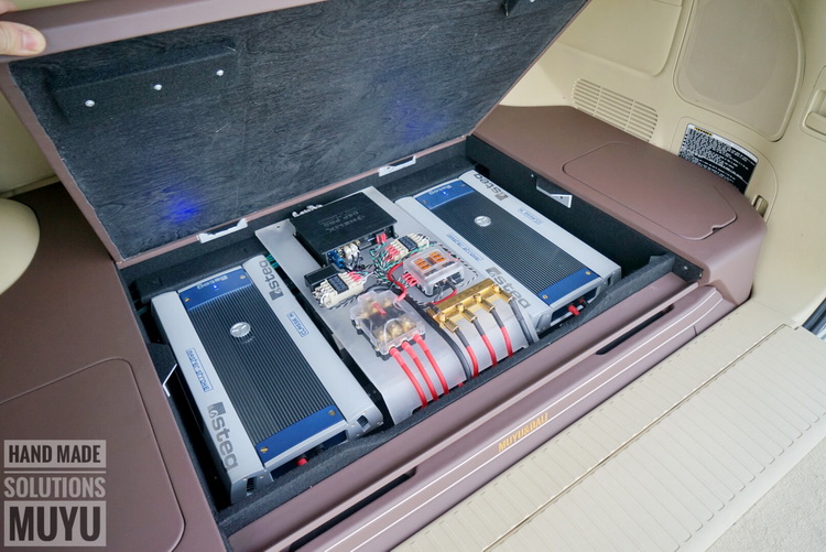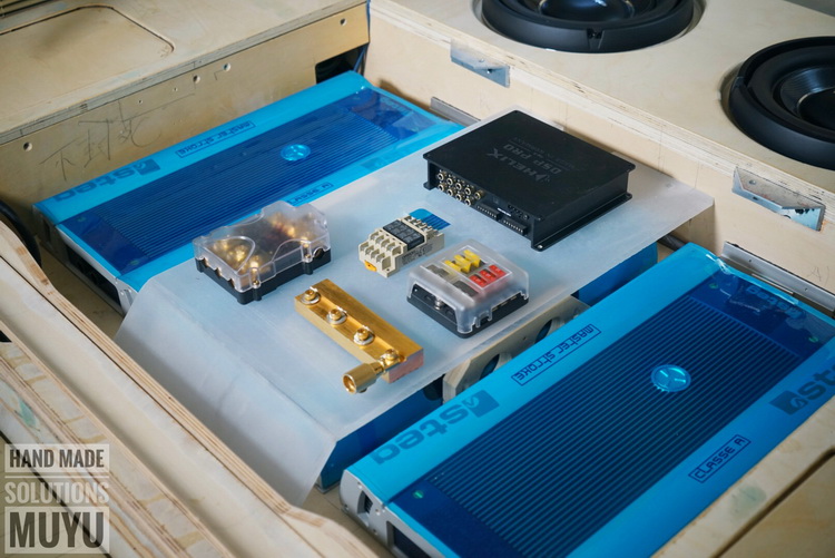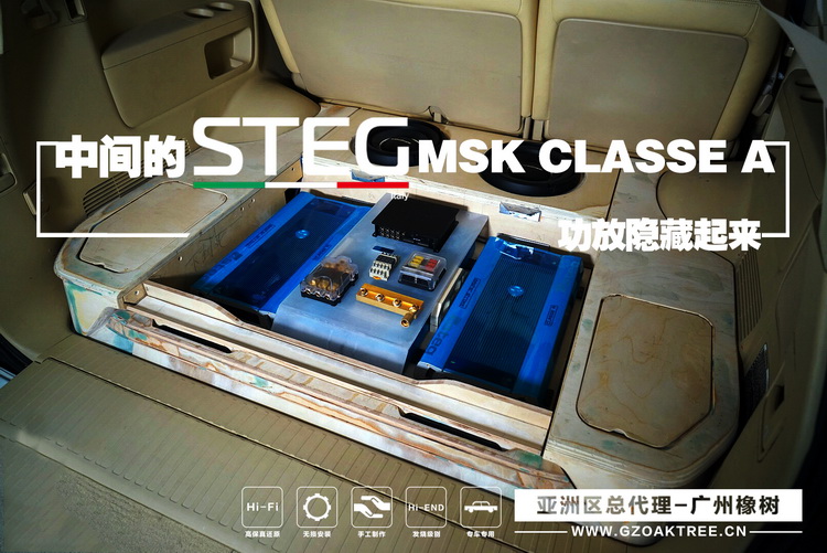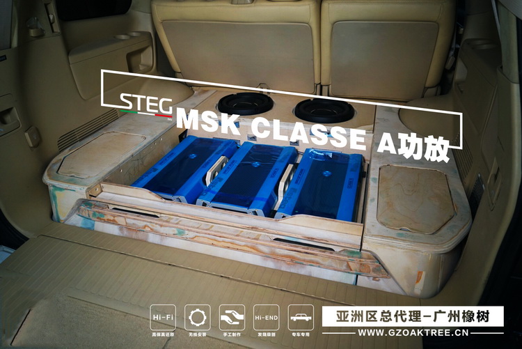 为了将这套喇叭的潜能充分展现,音源的部分也需要提升。建伍919主机提供超高的解析力,搭配喜力士处理器DSP PRO对信号的进一步优化,让音乐对细节的刻画更出色;通过三台意大利史泰格MSK CLASSE A旗舰级功放和一台意大利史泰格K401功放为声场喇叭和中置喇叭提供充沛强劲的功率,可以让喇叭火力全开的尽情释放美妙音质。而通过精湛的倒模工艺制作,技师将一众器材隐藏安装在尾箱底部,并且还添加了蟒蛇线材全车套件,让音响系统的运行更加高效、安全。