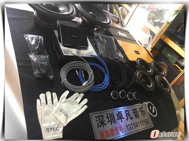 改装师傅先采用大白鲨隔音材料对车体进行相应的隔音升级之后,将前后声场喇叭更换成为意大利STEG史泰格 ST650C 套装喇叭,该喇叭盆架设计并采用细致力学支撑分布设计,这可以让盆架更加牢固,同时也能够减少共振发挥出特殊的音质效果体验。为了使得音响表现出饱满的立体层次感,添加两只意大利STEG史泰格 ST 12 寸低音喇叭采用倒模安装的方法进行安装在尾箱,同时为了保证喇叭的输出功率问题还添加了意大利STEG史泰格 ST401功放以及圣美歌 单路 3000.1功放进行推动,主机则更换成为歌航DSD播放器进行安装,在音源的纯净度优化方面则特别添加一台爱威DSP进行补充。