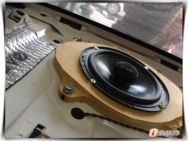 在使用隔音材料对汽车的门板做了隔音处理之后,惠州佐城汽车音响的改装技师,将汽车的前声场喇叭,替换成了史太格STEG ST650C套装,它的中低音单元由专用橡胶磁钢套进口橡胶边和特殊配方的纸质音盆制作而成,从而让喇叭的运动特性和真实性得到了提升。后声场使用的史太格STEG SQ同轴与前声场喇叭形成了优势互补,从而让音乐的展现形式更加的丰富。为了增加低音部分的下潜力度,改装技师还为汽车添加了一只爱威V5小钢炮超低音单元。
