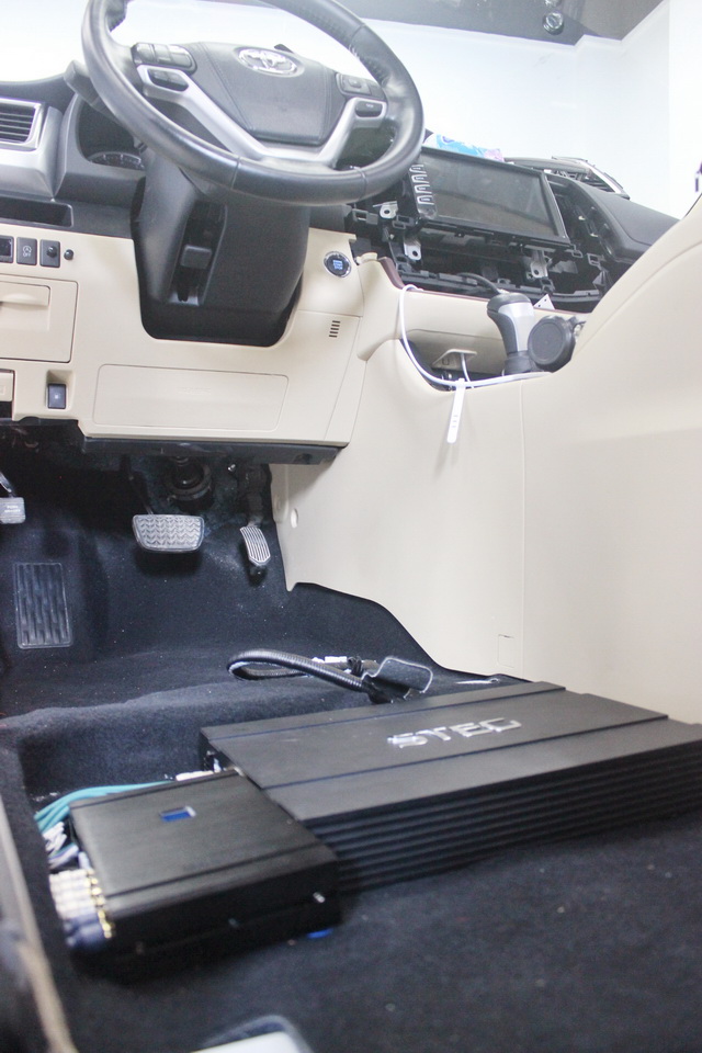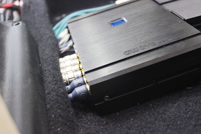 原车主机解析力不高,功率供给较小,导致音频信号质量不佳。因此改装技师为汽车主机添加了一台爱威DSP4-6,它可以过滤主机工作产生的杂音和相位缺失,以使得音源更加的干净。而为了解决原车音响系统功率供给不足的问题,改装技师则为汽车音响系统,添加了一台史太格STEG T401功放。