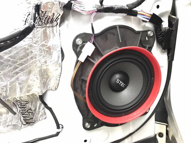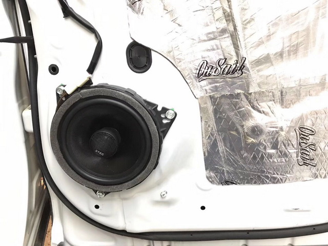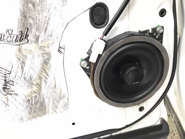 在使用隔音材料,对汽车的门板做了隔音处理之后,改装技师将汽车的前声场喇叭,替换成了意大利史太格STEG MT650C套装喇叭,它的做工精致、设计科学合理,使得其播放出来的音乐音色饱满、层次感分明。后声场使用的意大利史太格STEG SQ650同轴喇叭,则与前声场喇叭形成了优势互补,从而让音乐的表现形式更为丰富。