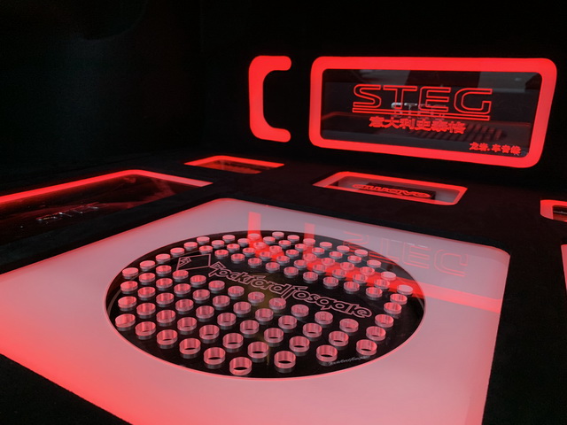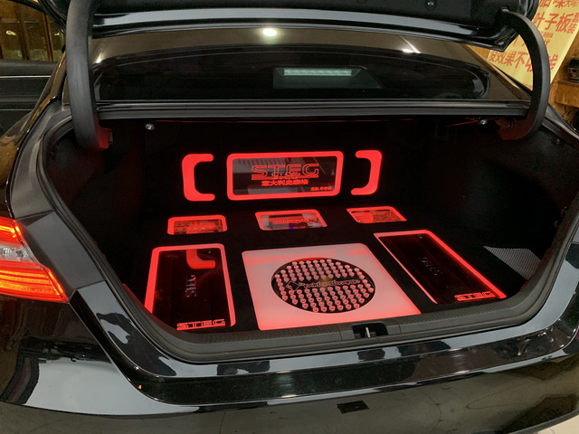 用来推动声场喇叭和功放的意大利史太格STEG超低音单元,经过合理摆放之后,安装在了汽车的尾箱。施工完成后,改装技师还为安装在尾箱部位的音响器材,添加了保护罩和灯光效果,让尾箱看起来整洁有序、美轮美奂。