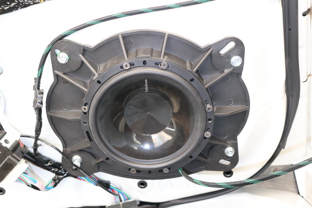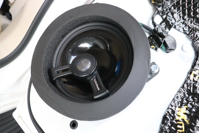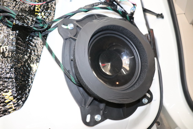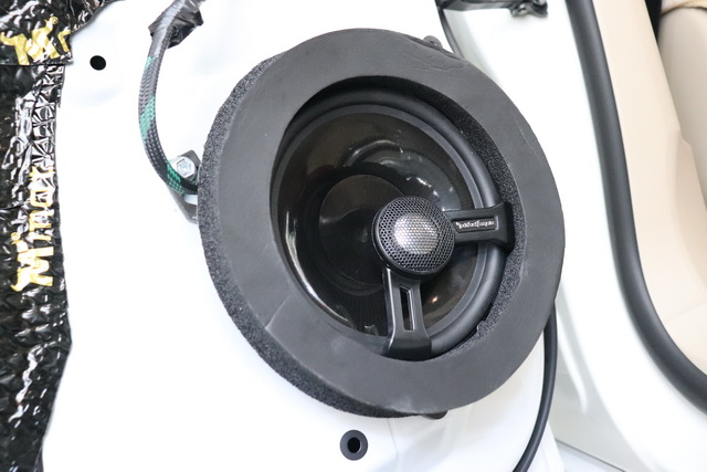 在使用大麦隔音对后门进行了双层隔音处理之后,改装技师将来福T1675-S喇叭安装在后车门板原位。同时为了保证喇叭的呈现效果更加完美,改装技师还为喇叭添加了垫圈,减少喇叭工作时的杂音噪声,保证音色的收拢。