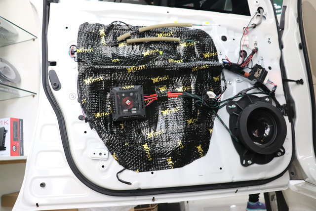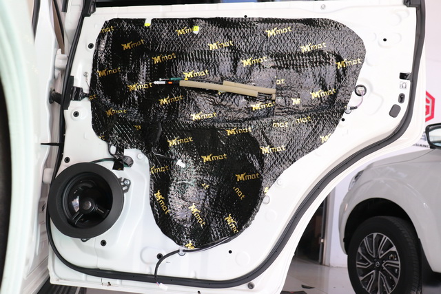 拆开汽车门板可以发现,原车门板部位的隔音措施较为欠缺,只有单薄的一层塑料薄膜,并不能有效的隔绝噪音。因此改装技师使用大麦隔音对车门进行了双层隔音处理,在增强门板钣金刚性,抑制共振噪声的同时,也可以有效隔绝噪音,既保护了车主行车旅途的安静,又保证了喇叭的工作环境。