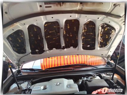 雷克萨斯的噪声产生的主要部位包括引擎盖、门板、底盘和尾箱。但不同部位产生的噪声类型是不相同的,所以在施工的时候使用的材料和隔音手法也各不相同。引擎盖主要是共振产生的噪声,因此江门爱音乐的改装技师使用大麦隔音减震胶对汽车的引擎盖做了减振处理。