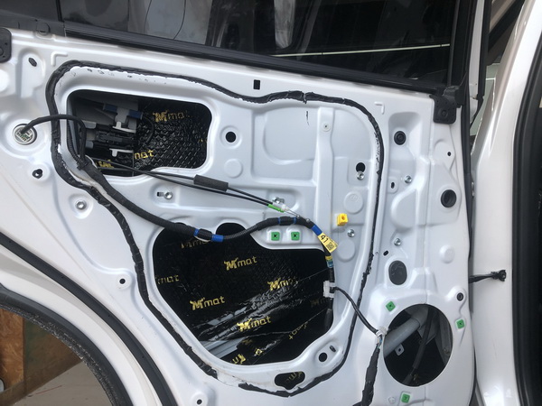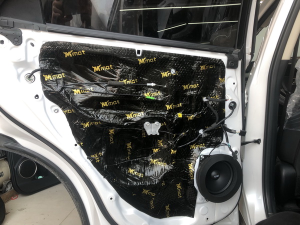 在音响改装之前,对汽车门板的隔音非常重要,因为门板是安装喇叭的地方,一个良好的门板隔音环境可以将喇叭得到更好地发挥。改装师将门板外壳拆卸下来,可以看到内部隔音措施非常简陋,只有一层薄膜,将其清理干净后,使用大麦隔音材料将门板内部进行第一层减震处理,大麦隔音材料含有4层结构,并使用环保材质,对器材和人体都没有伤害,经过减震处理后,可以有效减少门板内部钣金共振。在第二层使用大麦减震垫进行隔音密封,将门板打造成密闭的箱体结构,减少风噪和胎噪进入。