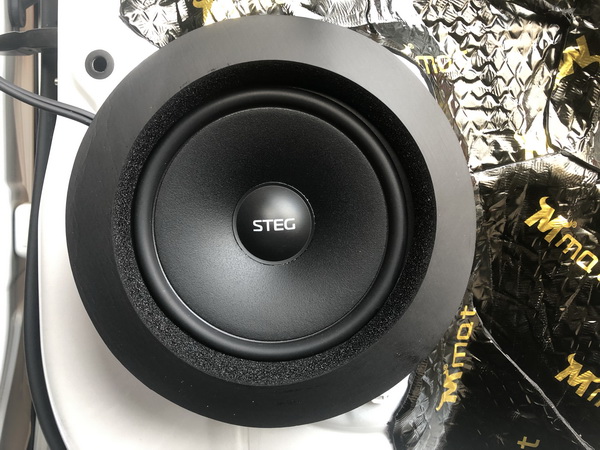 在前声场喇叭安装意大利史泰格MT650C喇叭,这款喇叭中低音喇叭单元采用的是STEG定制的低谐振高刚性铝盆架,超大磁路驱动,保证大动态下不失真,高音单元的外观非常精致,外表是CNC高光处理的铝架,核心部件是28mm丝膜球顶振膜,使得它的解析力非常高,而且声音明亮而贵气感足。改装师将中低音单元安装在汽车门板原位上。