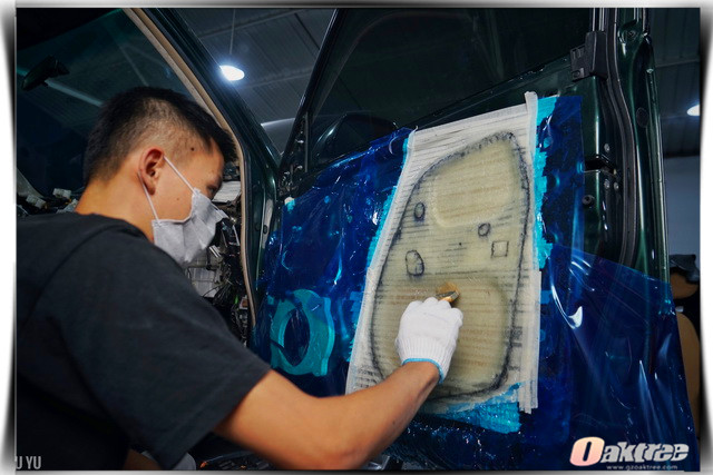 为了给声场喇叭提供一个良好的工作环境,先使用狮龙隔音材料对车门进行隔音处理,不仅可以阻隔风噪的入侵,同时可以是门板形成一个密闭的箱体空间。为了保证音源端声音的纯净性,增添了一台美国DB