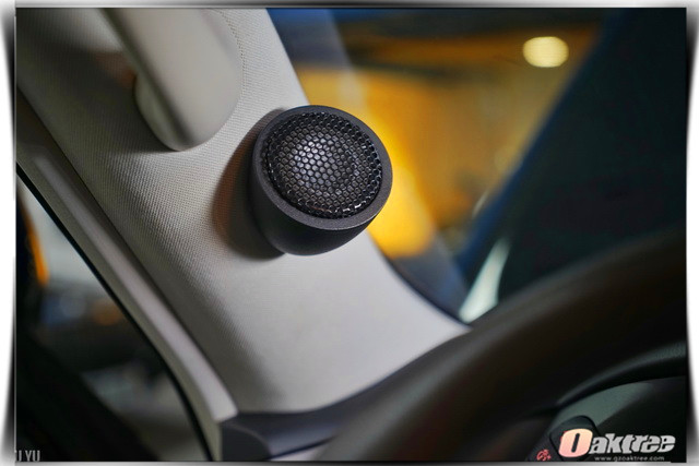 前声场高音喇叭采用A柱倒模的安装工艺,高音与中低音分离,高音单元使声场位置提高至听者耳畔,是声音听起来更具有层次感。中低音单元安装与前门板处,改装技师特意为其添加了木质垫圈,木质垫圈的添加可以将声波全部散射出去,避免引起门板的共振,保证了喇叭音响不受音响。