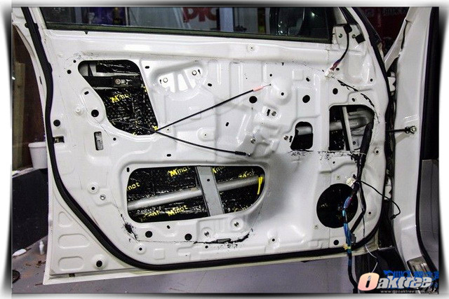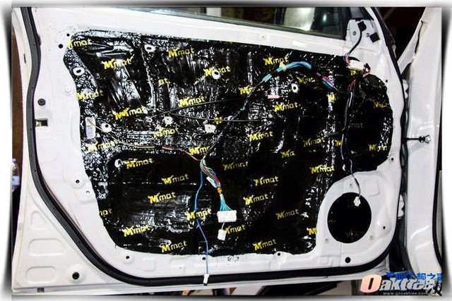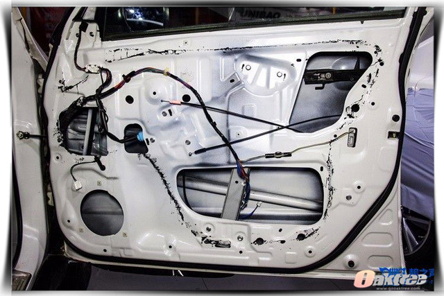 使用大麦隔音材料对汽车门板做第一层的隔音处理,降低门板共振噪声