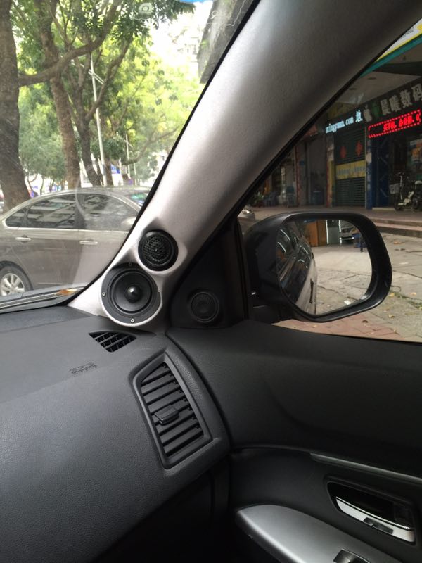 美国西海岸三分频高音单元和中音单元倒模安装在A柱上