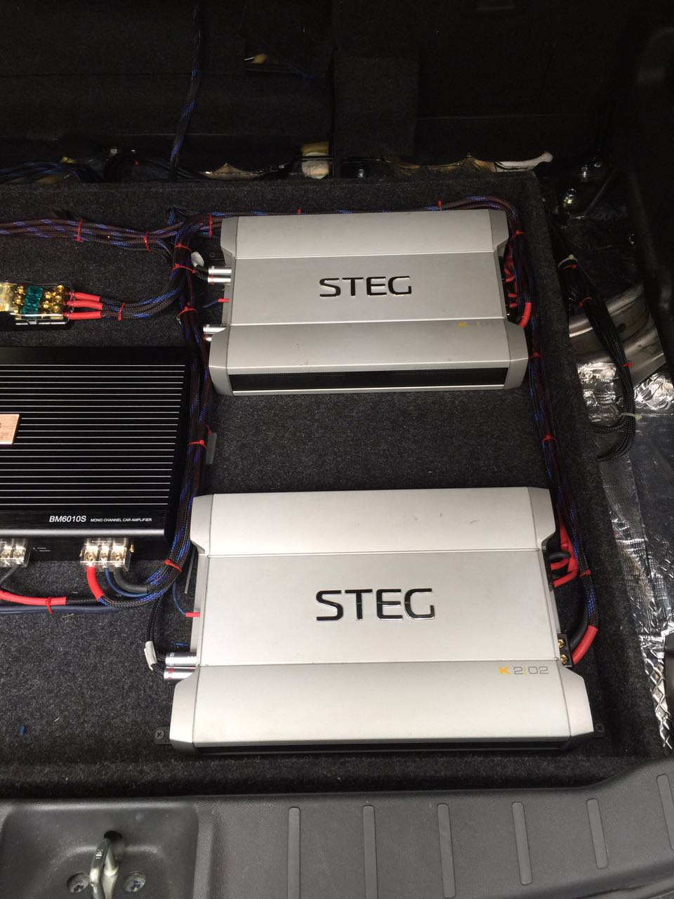 三台功放安装在汽车尾箱