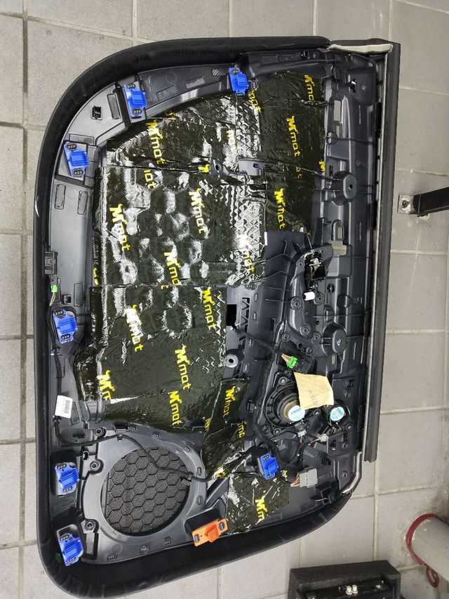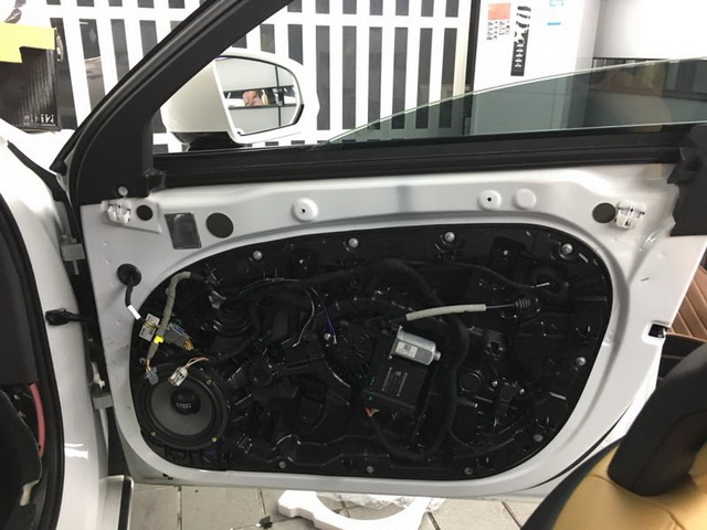 原车门板铁皮结构很厚实,但门板内部的空洞结构较多,导致门板部位的噪声很大。因此改装技师使用大麦环保隔音材料,对汽车的门板和饰盖,做了全面的隔音处理,有效降低了门板自身的共振噪声,并增强了门板的密封性,从而为声场喇叭创造了一个良好的工作环境。