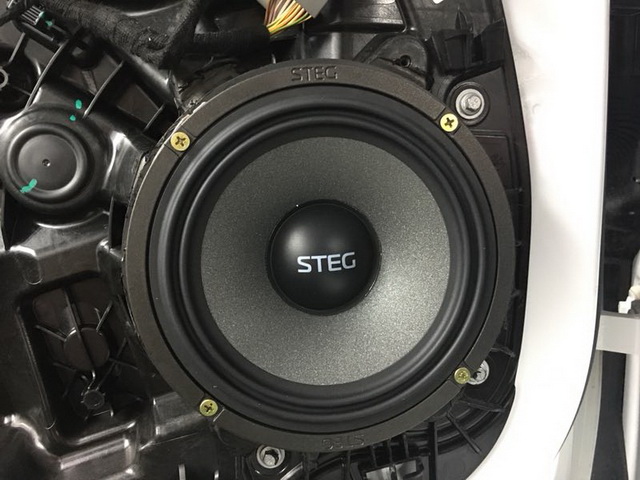 根据车主听音喜好,改装技师将汽车的前声场喇叭,替换成了意大利史太格STEG MT650C三分频套装喇叭,它的中音和中低音单元采用复合纸质音盆,,在纸盆的表面做了喷银砂处理,这使得其具有良好的韧性和弹性;高音单元则使用了丝膜球顶设计,并使用了钕磁进行驱动,让中低音单元高亢亮丽,穿透力很强。
