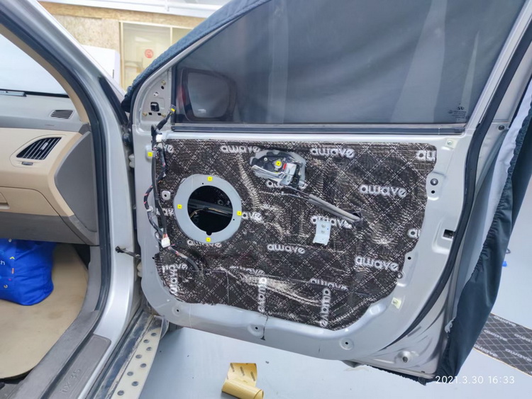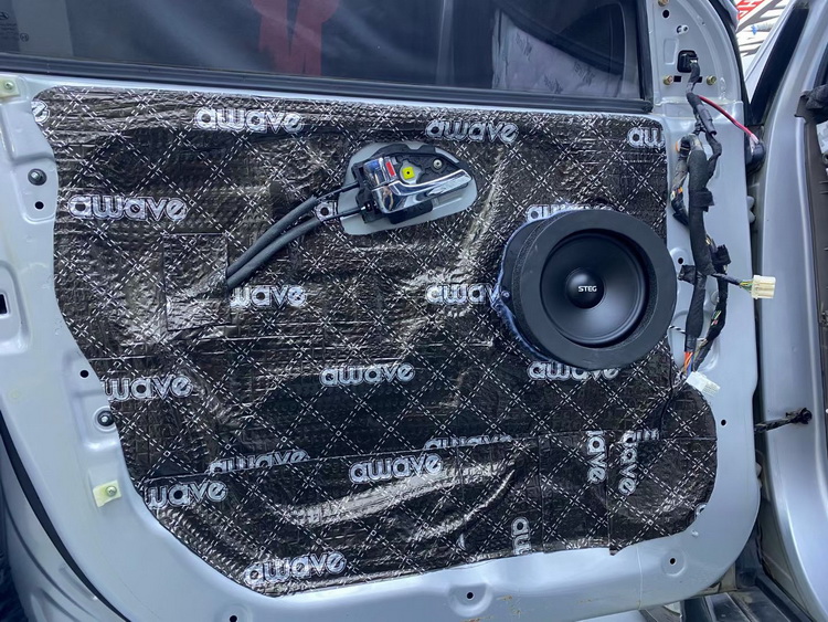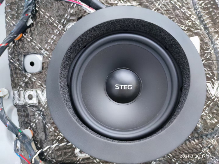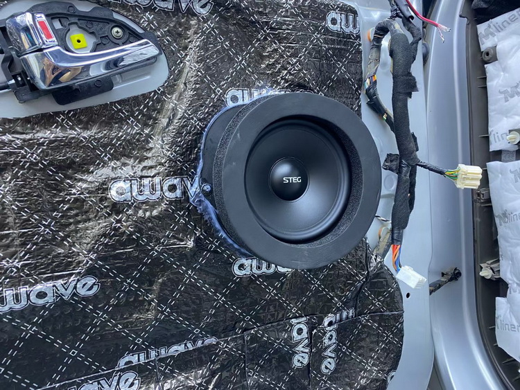 在使用爱威隔音材料,对汽车的门板做了隔音处理之后,技师将前声场喇叭,替换成了意大利史泰格LEO650C套装喇叭,它的中低音单元使用了特殊配方的纸质音盆,并使用进口悬边进行保护,使得中低音部分的动态范围极宽,播放出来的音乐丰富饱满,感染力极佳;高音部分使用了高端丝质振膜,让高频部分自然通透,穿透力极佳。