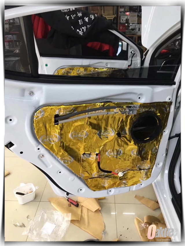 现代领动的原车隔音措施较为欠缺,汽车在行驶的时候,车厢内的噪声非常的明显。因此江门车好友的改装技师,使用隔音材料,对全车做了隔音处理,这不仅降低了车厢内的噪声,同时也为声场喇叭创造了一个良好的工作环境。