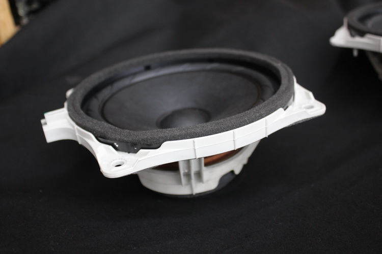 可以看到原车喇叭是塑料材质,做工较差,用料不足,而且原车门板的隔音措施欠缺,隔音效果差使喇叭的工作环境恶劣,这样的环境和喇叭很难有好的声音表现,所以技师使用隔音材料对门板做隔音的升级处理,为喇叭创造了一个良好的工作环境,能够让喇叭的发挥更出色。