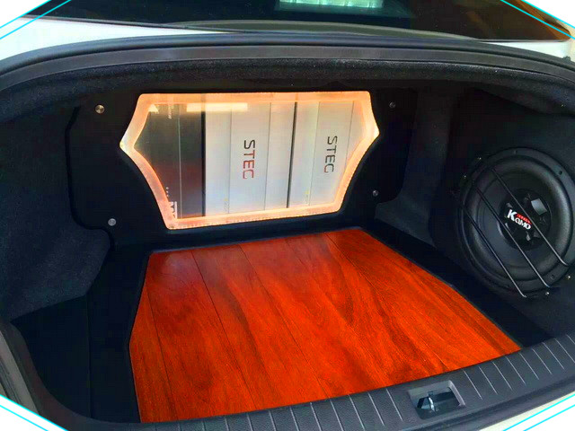 深圳卓凡音樂的改装技师不仅注重音响的品质,同时对音响器材的安装位置也十分重视,卡莫12寸超低音单元倒模安装在了尾箱的侧壁上,而两台意大利STEG史太格 K4-01功放则安装在了尾箱壁上,这不仅节省了存储的空间,同时在视觉上也极具震撼力。
