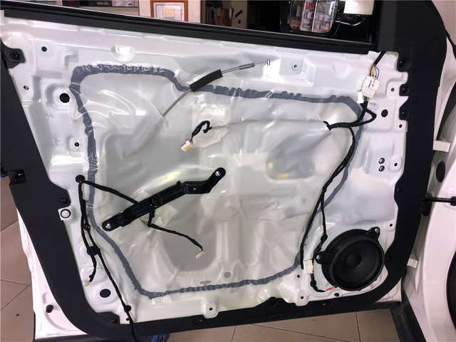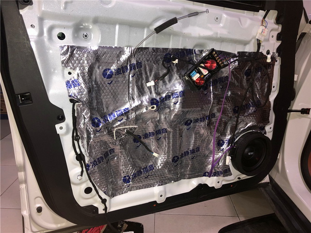 拆开汽车门板饰盖,可以看到门板内部只有一层简单的塑料薄膜,很难起到良好隔音效果。改装技师将原车劣质隔音材料清除。使用凌静隔音材料,对汽车的门板做了双层隔音处理,有效降低了门板自身共振噪声,并阻止了风噪的传入。从而为声场喇叭创造了一个良好工作环境。