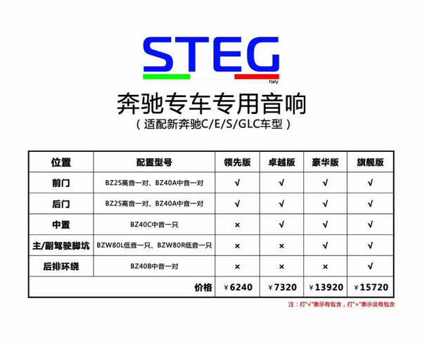 奔驰三分频、领xian版、卓越版、豪华版、旗舰版,具体配置以及零售价(不含安装及耗材费用)如下图示: