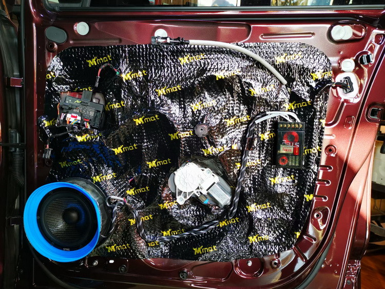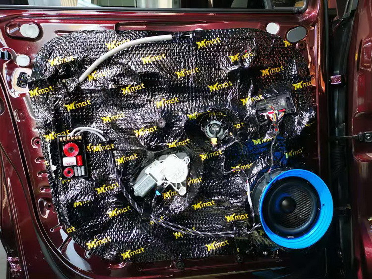 原车门板隔音措施简单,导致门板处噪声较大,这对音响品质也产生了很大的影响,因此技师使用隔音材料,对汽车门板进行了隔音处理,给喇叭提供了良好的工作环境。