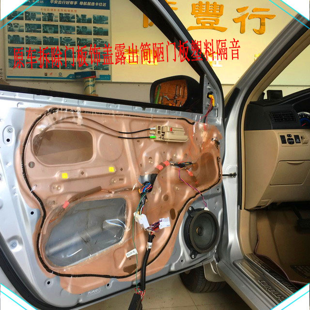 为了给汽车的声场喇叭创造一个相对良好的工作环境,中山亿丰行改装师傅先采用是使用双门隔音的方式对汽车的门板做了双层的隔音处理,这样能降低门板共振噪音同时也可以为声场喇叭制作了一个小型的箱体一般,从而提升喇叭的音色的立体效果。